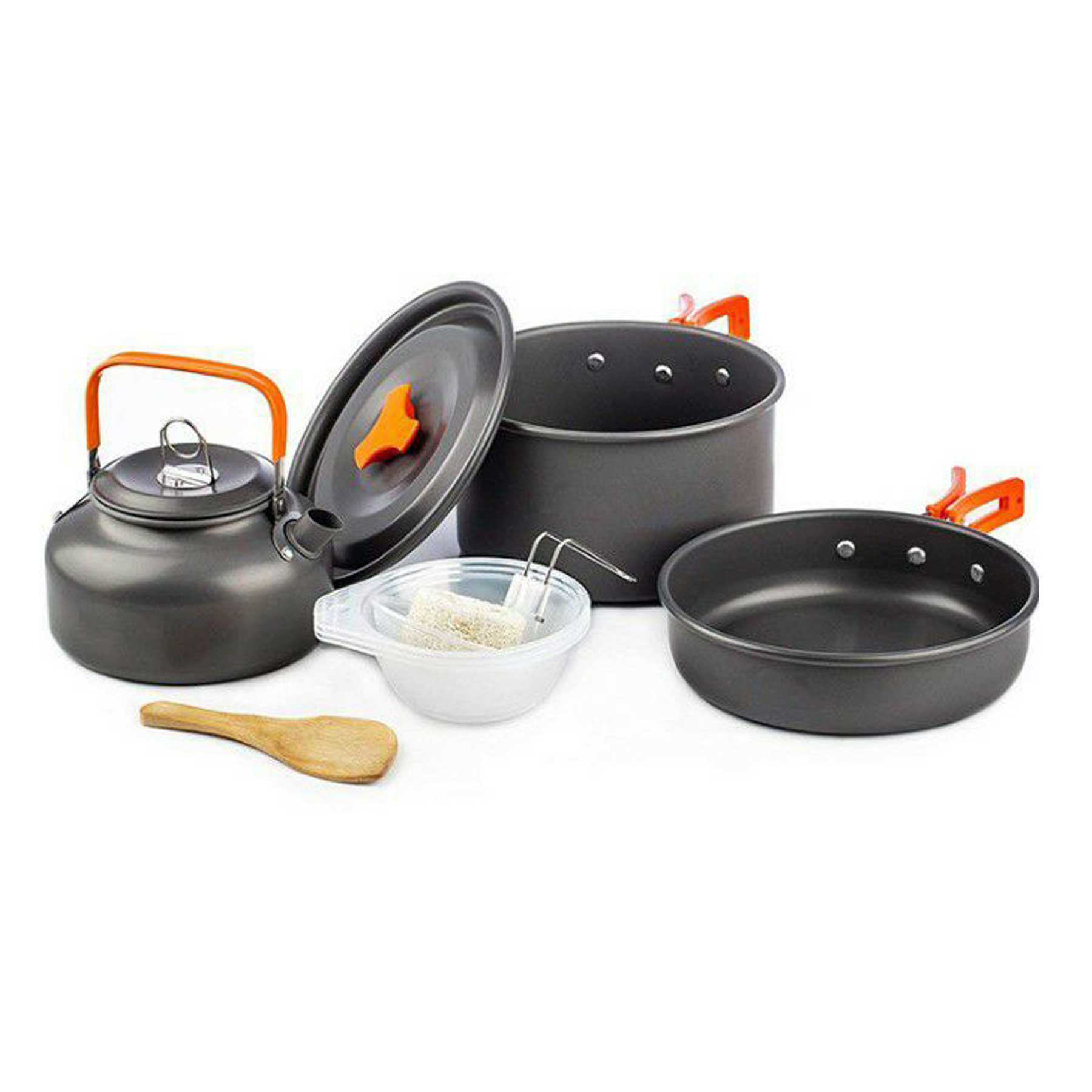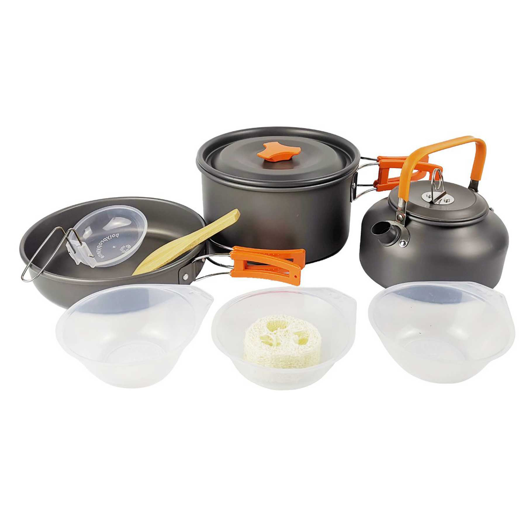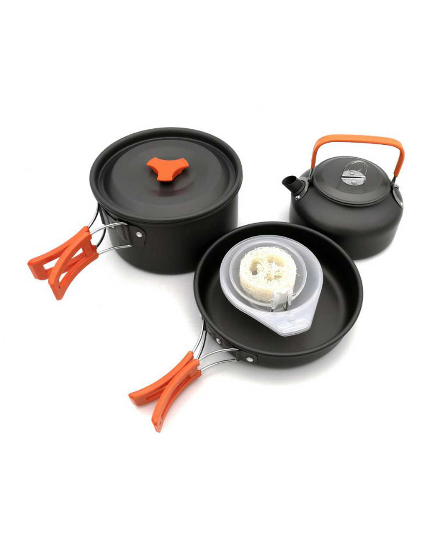 - مجموعه ظروف کمپینگ : قابلمه، ماهیتابه، کتری، کفگیر، ملاقه، سه کاسه پلاستیکی و اسکاج.